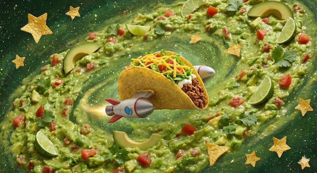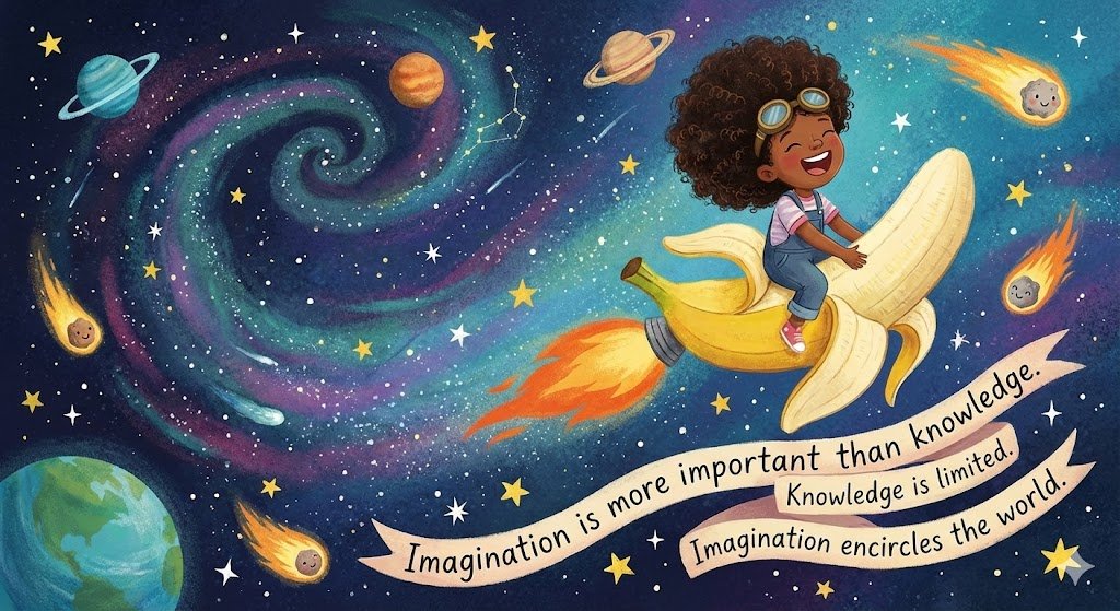 Banana astronaut planting a glowing flag on a distant planet with aurora filled skies