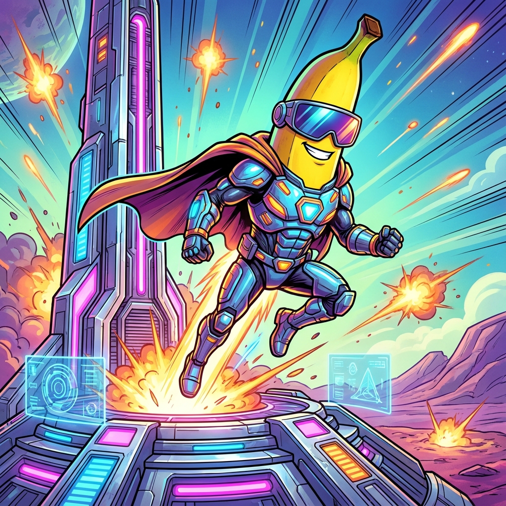 A cool banana hero wearing futuristic shades leaping from a sci-fi launch pad