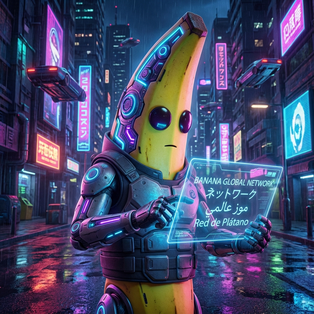 A futuristic banana character holding a holographic interface with multilingual text
