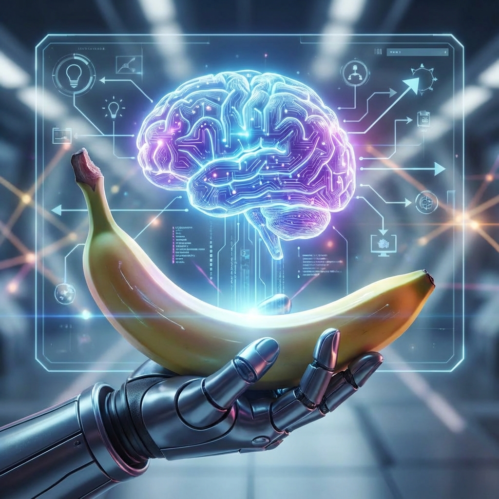 A banana interacting with a glowing AI brain hologram