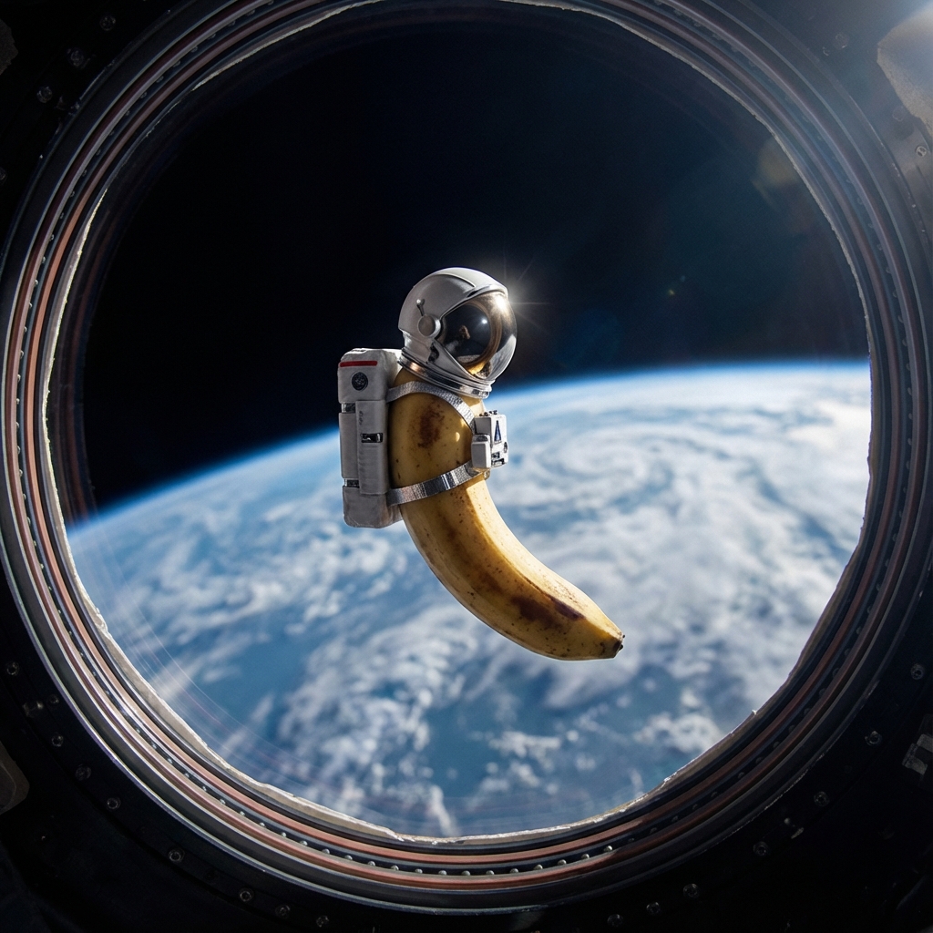 A cinematic shot of a banana in a space suit floating in zero gravity